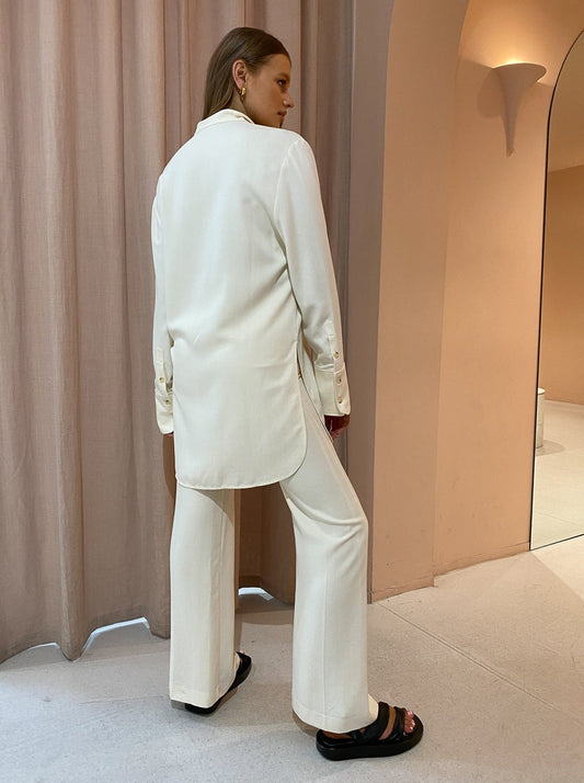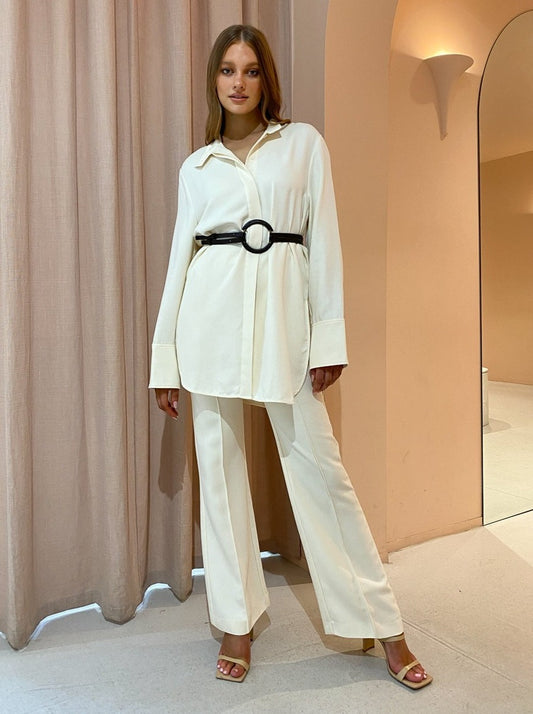 Shaped with a subtle flare, the Alvis Pant can be perfectly paired with the matching Alvis Shirt in Cream buttoned up for a tonal and sophisticated desk to dusk look.