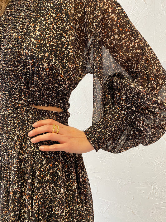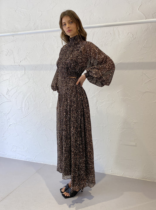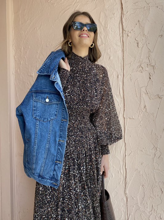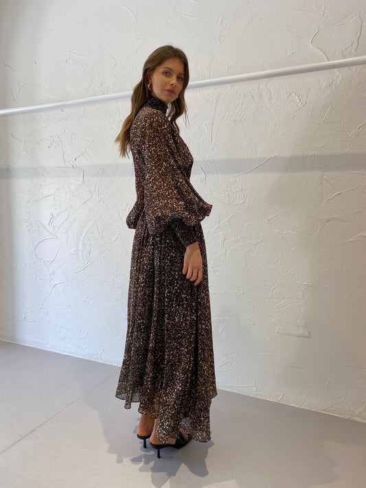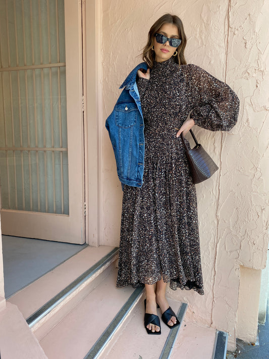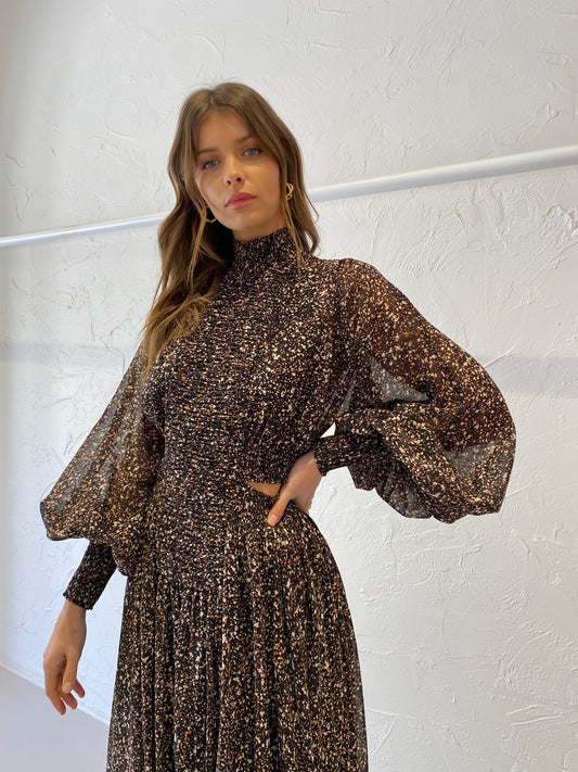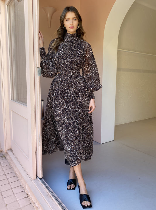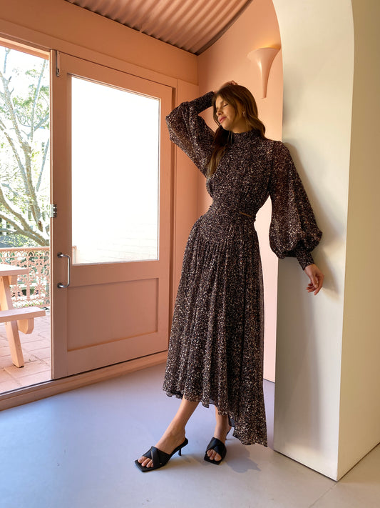 The Camilla and Marc Cirro Midi Dress in Print is crafted from a custom mottled floral print. The balloon sleeves and shirring details along with the angled hemline create an elegant piece that will have you floating around in style.