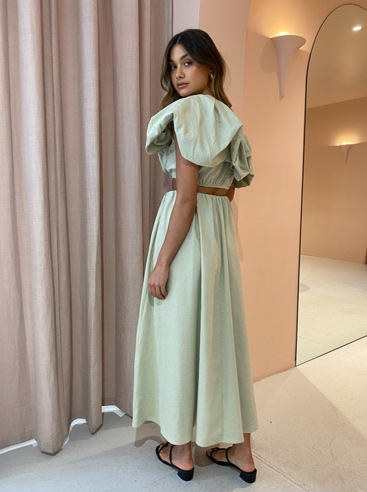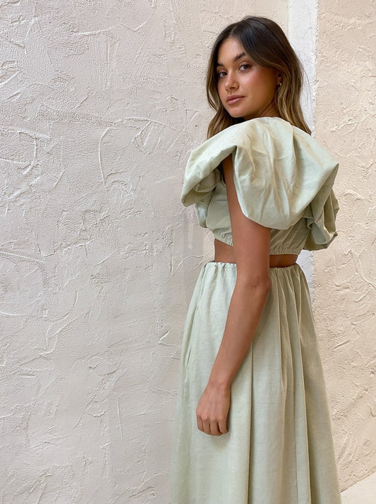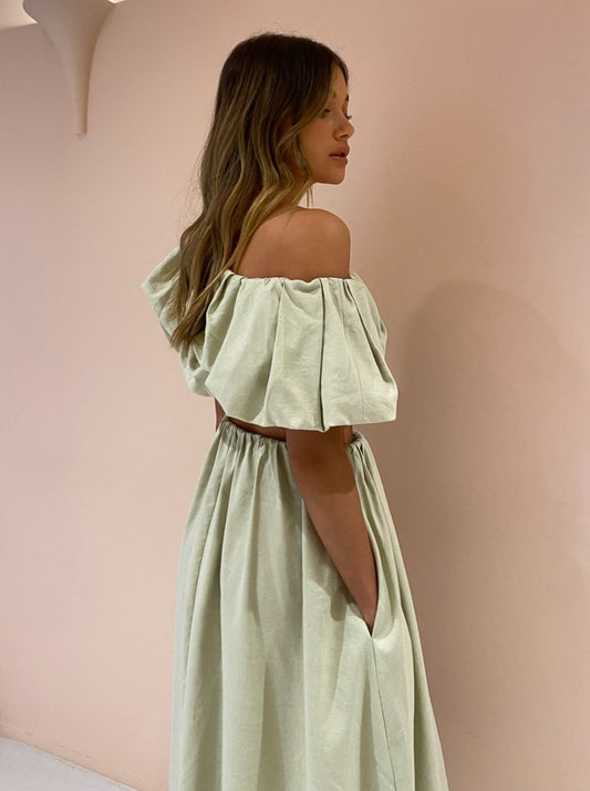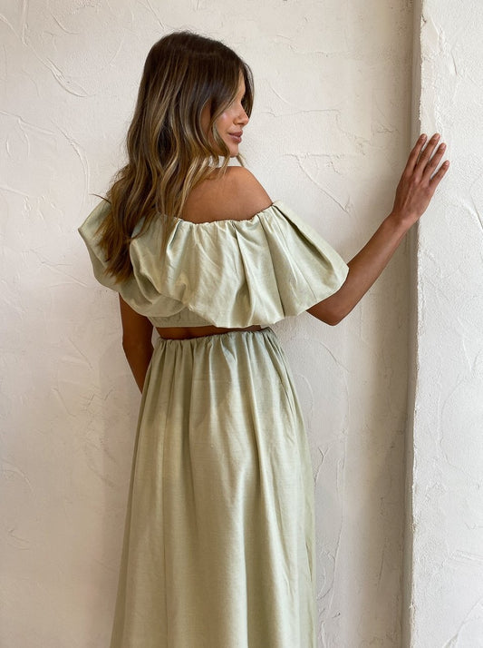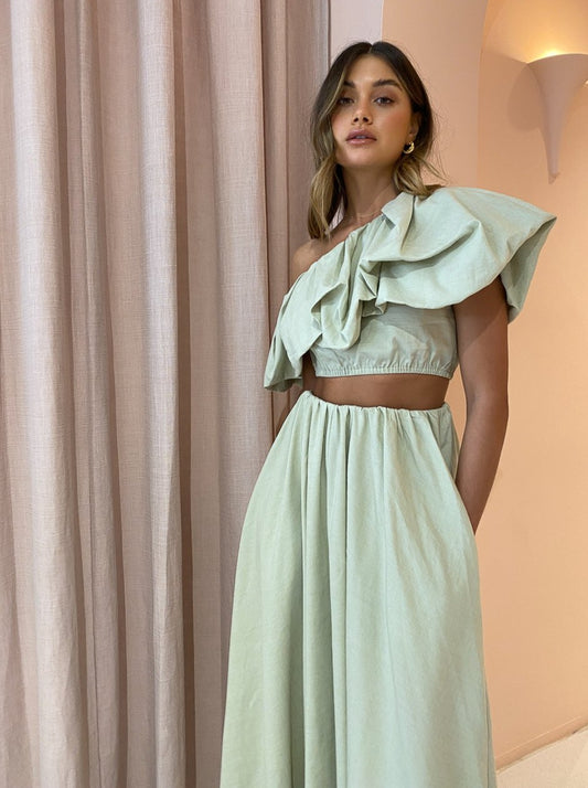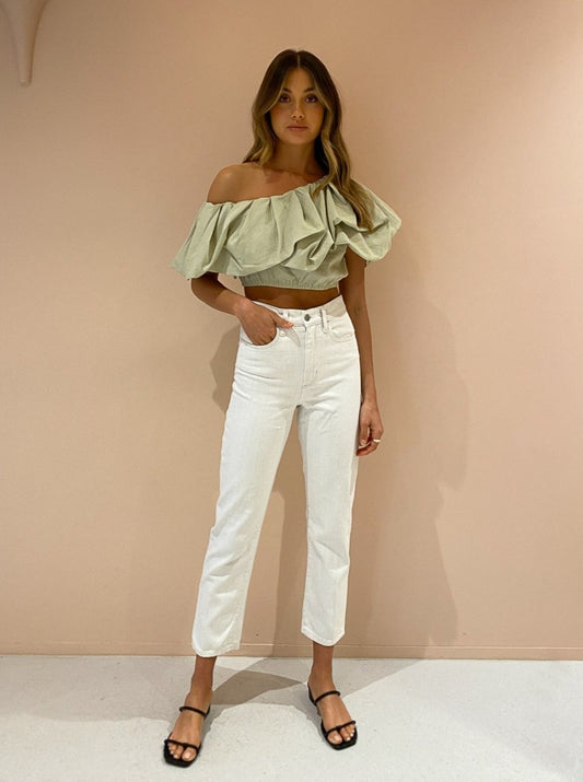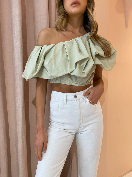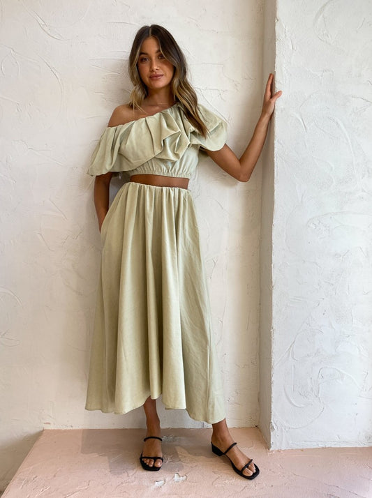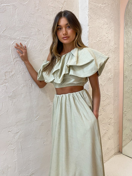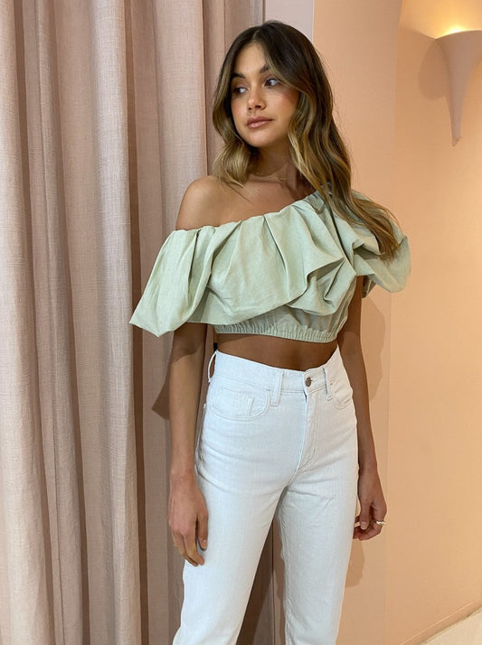 Designed to be worn with ease, the Dimaro Top is crafted from a linen blend in a neutral Cardamom Marle hue that will pair back with your Coco wardrobe. Fitted comfortably on the upper waist in a cropped length, it's and off-shoulder asymmetrical silhouette that highlights the femme décolletage.