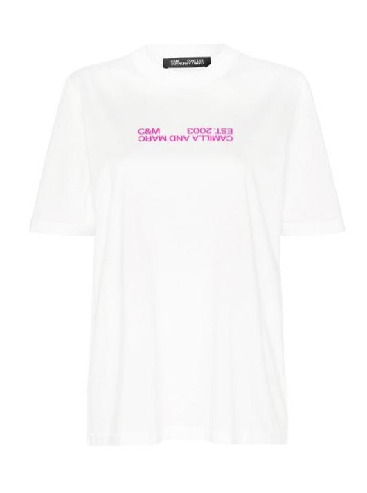 A relaxed oversized fit crafted in a soft cotton, and featuring the bold hot pink Camilla and Marc logo.