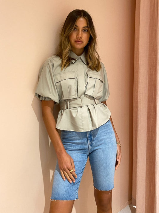 The Camilla and Marc Frost Puff Sleeve Shirt in Oyster is the safari-inspired cropped shirt to add to your capsule wardrobe.