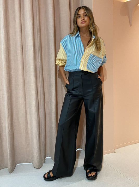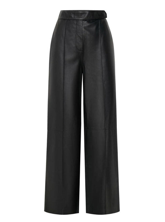 With a contemporary design focus, these 100% leather pants are cut in a high waisted wide leg silhouette with front panelling through the leg and a pin stitch. Featuring front and back pockets, a fly front opening and straight waistband with extension for comfort.