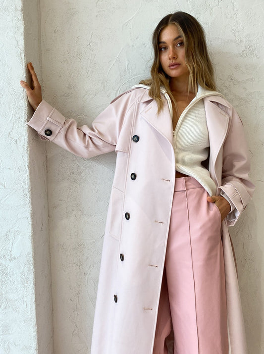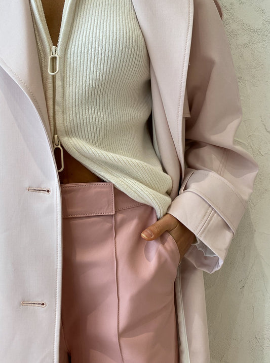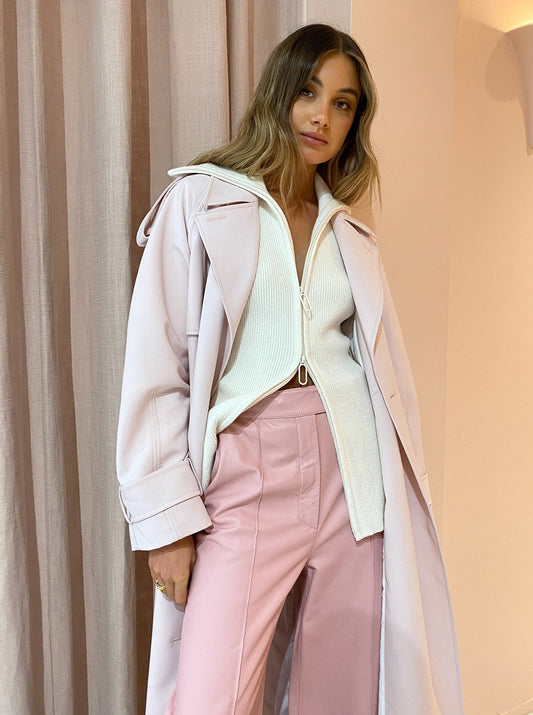 For a perfect pink moment, complete with the Earlie Zip Through Sweater in Snow White, Alias Mae Camelia Heel in Bone and the Camilla and Marc Lennox Trench in Blossom layered over the top.