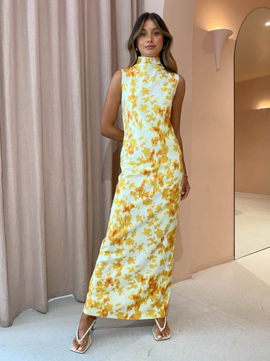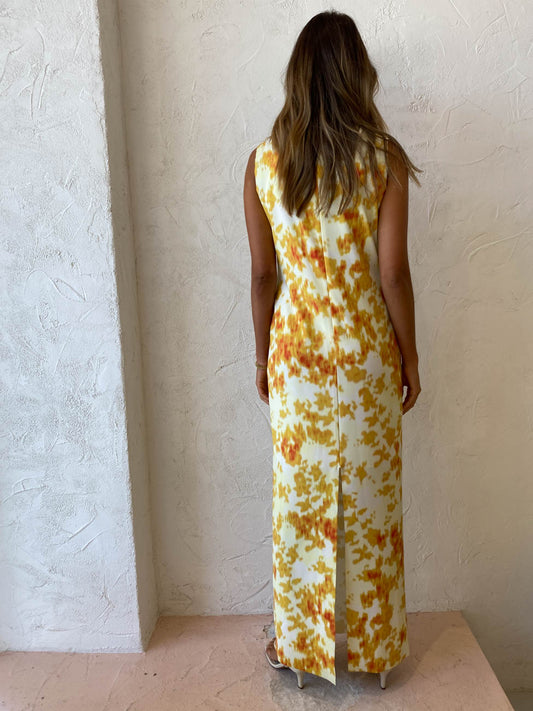 Designed with a contemporary focus, this sleeveless column maxi dress is crafted from a soft and slightly stretchy fabrication in a bespoke abstract floral print. Featuring french darts, an invisible zipper at back neck and laser cut hems.