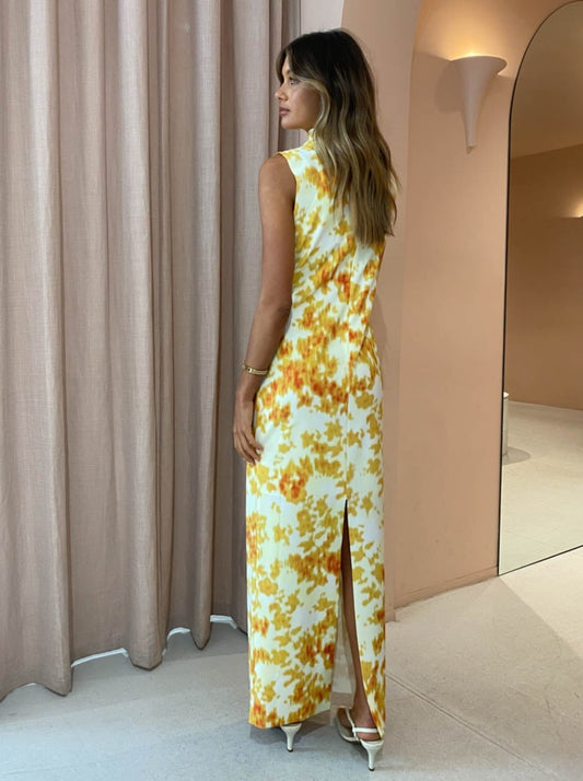 Admired for its sophisticated funnel neckline and playful back hem split, the Samba Maxi is coveted for wedding festivities, desk to dusk occasions and formal soirees.