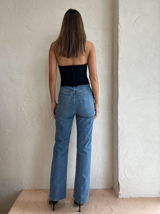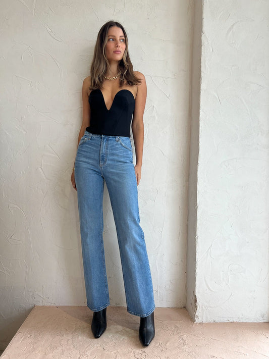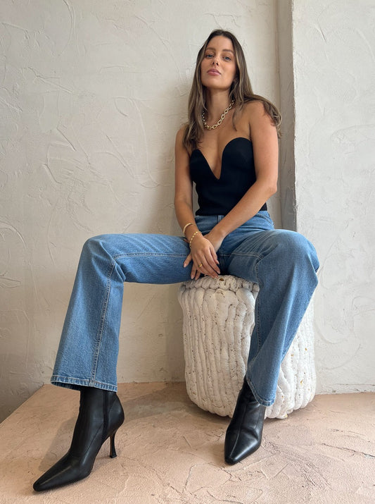 Complete the look with Camilla and Marc Gordon Pant in Black, Alias Mae Carmen Boots in Black Soft Leather, Arms of Eve Isadora Gold Earrings, Arms of Eve Elodi Gold Cuff Bracelet in Gold, Reliquia Hernan Necklace in Gold/Pearl, Arms of Eve Emilia Gold Bracelet in Gold, Nobody Loretta Jean in Interstellar Blue, Porter Triple Heirloom Ring in Gold and the Camilla and Marc Camellia Blazer in Black.