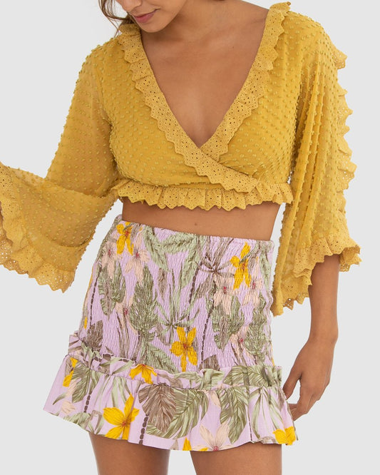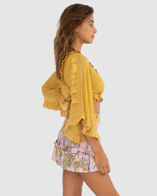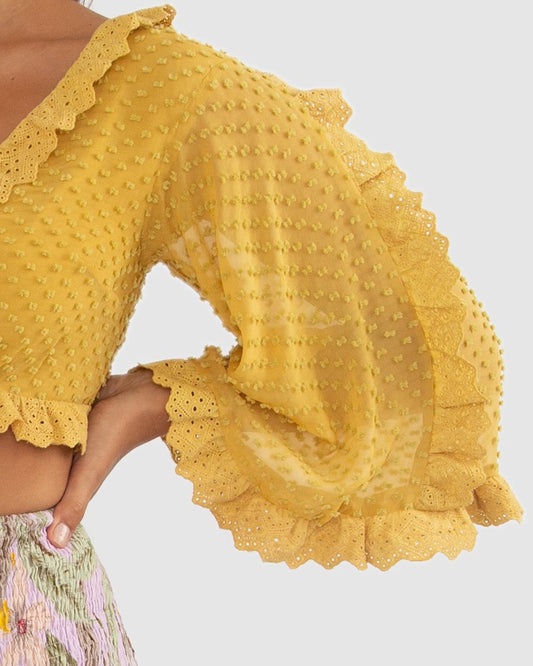 The Carver Abella Top, features a cropped length with a trim detailed waist. A wide, billowing sleeve is a playful, statement look. Lace trims detail this piece and a carefully considered low cut wrap neck makes for a flattering look. With a super-cute flicked out hem that sits high on your waist, we will have you feeling light-hearted and fun - just how we like it.