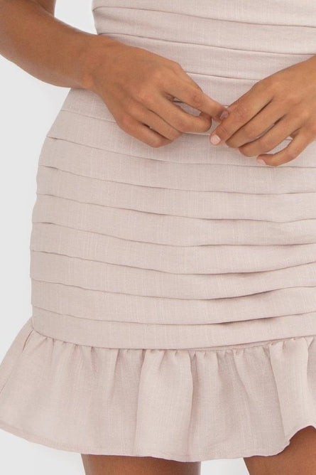 Excite the senses with playful frills. This piece will be a suitcase essential. Easy to wear and care with pure linen fabrication. Exposing sun kissed décolletage. Spaghetti thin straps balance the figure hugging folds whilst a flirtatious hem skims the thigh. Sweet sangria in hand get lost in the beat as you samba through the night.