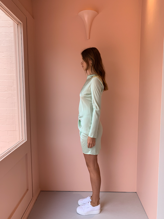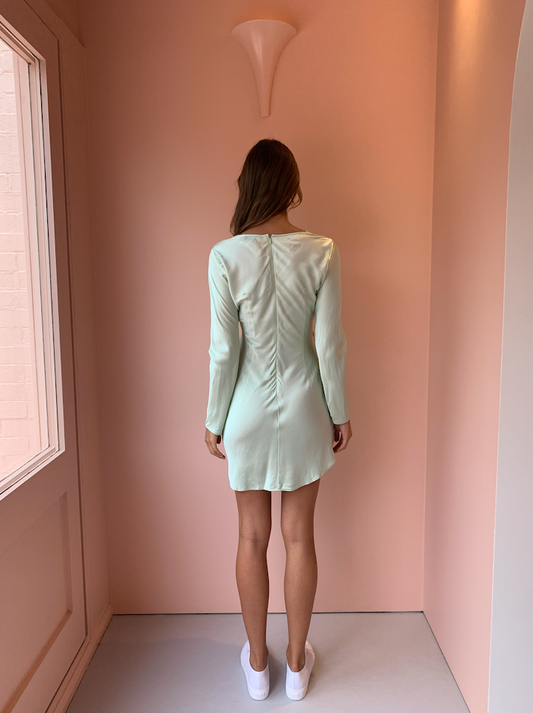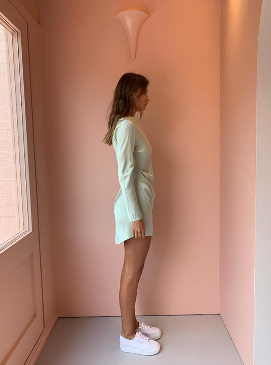 A fun and flirty Winter cocktail mini featuring long sleeves, curved hem and statement gathered details.