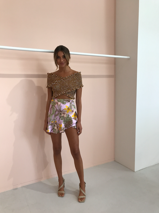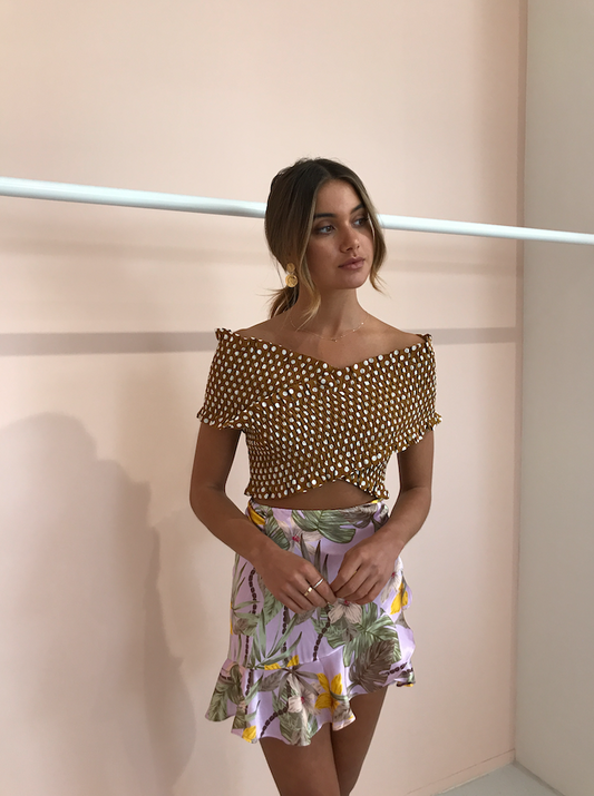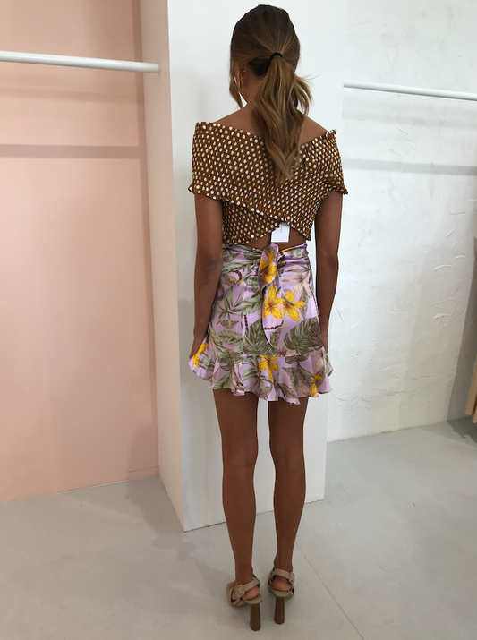 A wrap skirt makes for easy wear, every time. Playful flounce hem details and a high cut waist is perfect for summer days that turn into nights. Watch the scattered palms sway in the breeze as your feet sink into the warm sand.