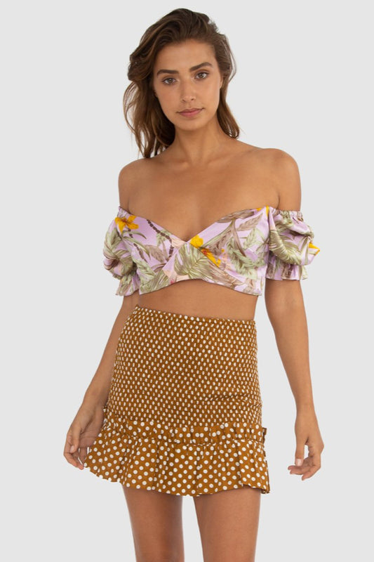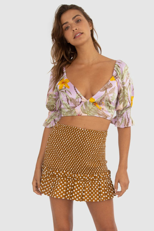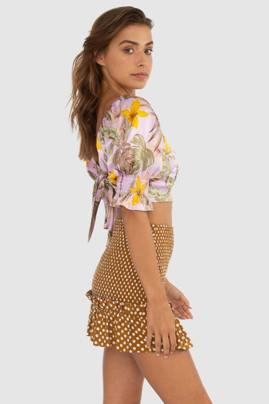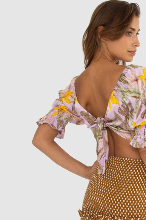 A plunging neckline allows your décolletage to embrace the sun. Playful voluminous sleeves and a high crop come to tie in place at the back.
