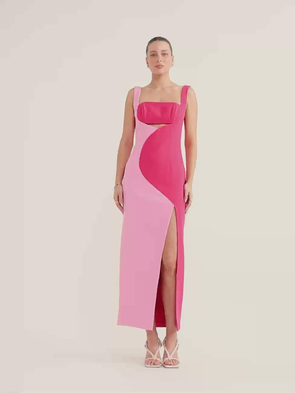 Turn heads at any special occasion in the Caterina Two-Tone Curve Midi Dress in Pink Multi from By Johnny.