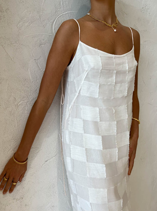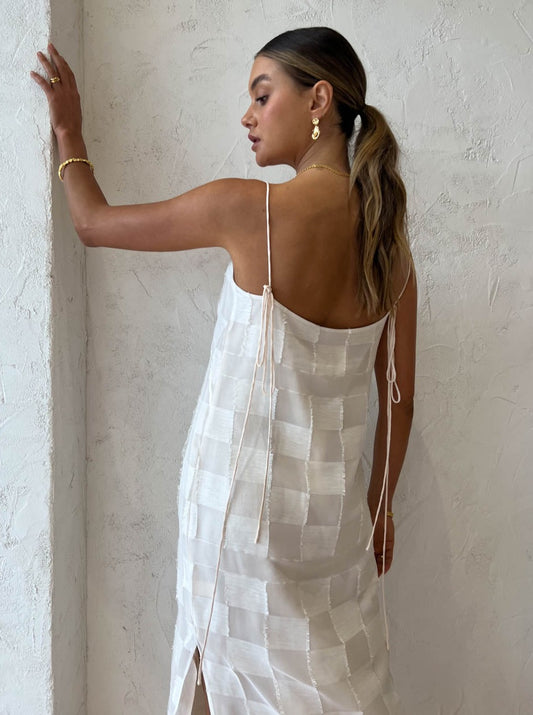 Beautifully crafted in linen/silk flocked checkerboard woven, this special fabric is semi sheer and features a detailed fringed surface. This simple, straight cut dress slips onto the body in a breezy silhouette and features side splits and long rouleaux ties at the shoulder for you to style your way and finished with a low scoop back.