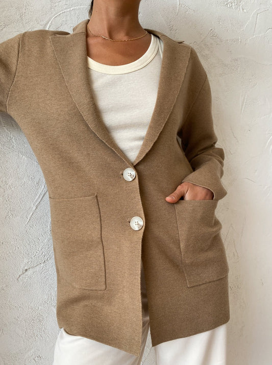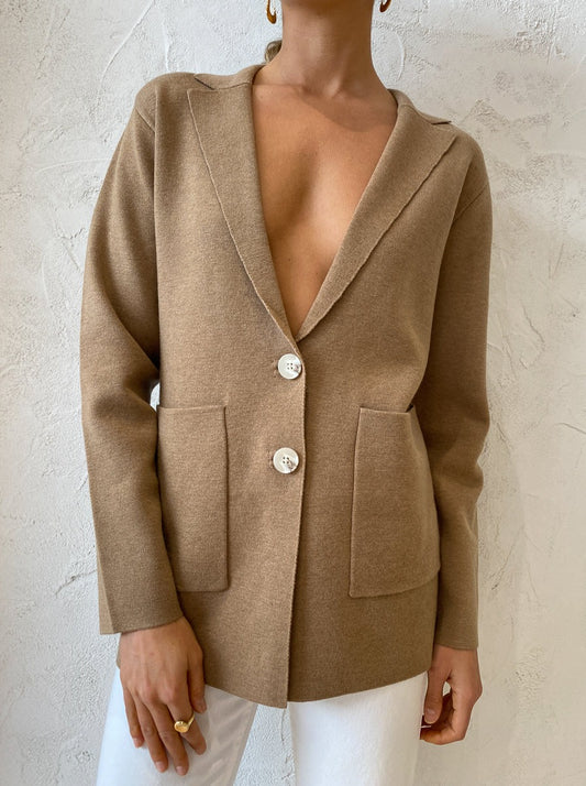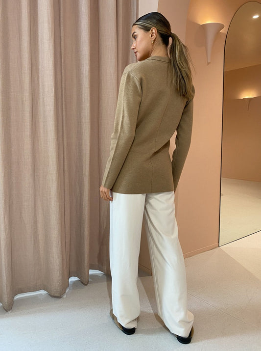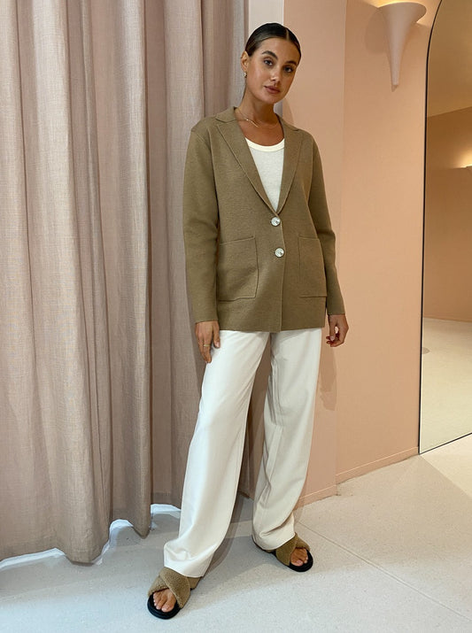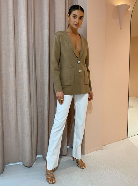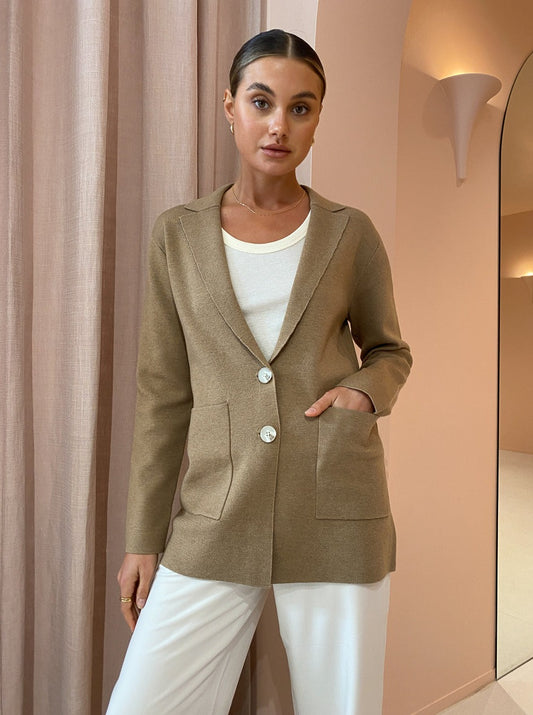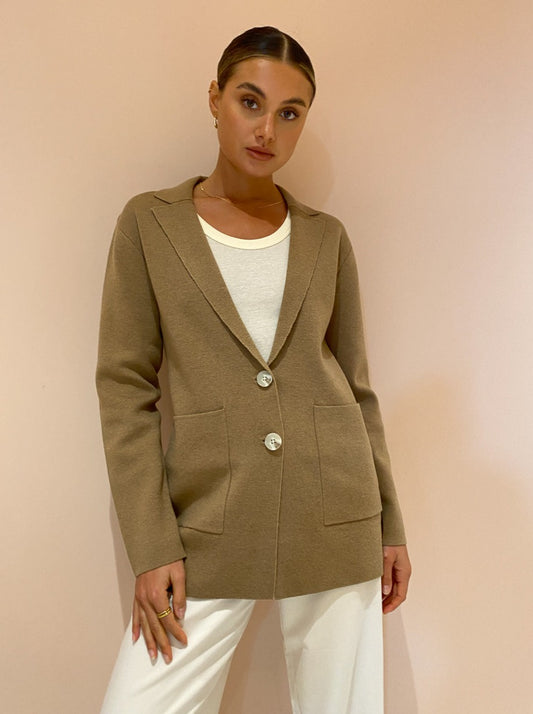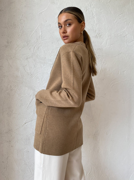 Invest in Elka Collective’s sophisticated Elle Knit Jacket in Camel for year round Coco girl styling.