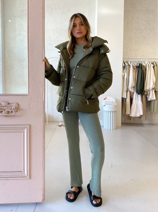 Coco Styling Tip: Feel complete in this tracking set by pairing it back with the Ena Pelly Utility Puffer Jacket in Khaki and the Alias Mae Paris Slide in Black Leather.