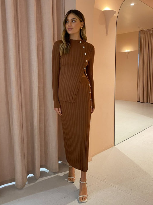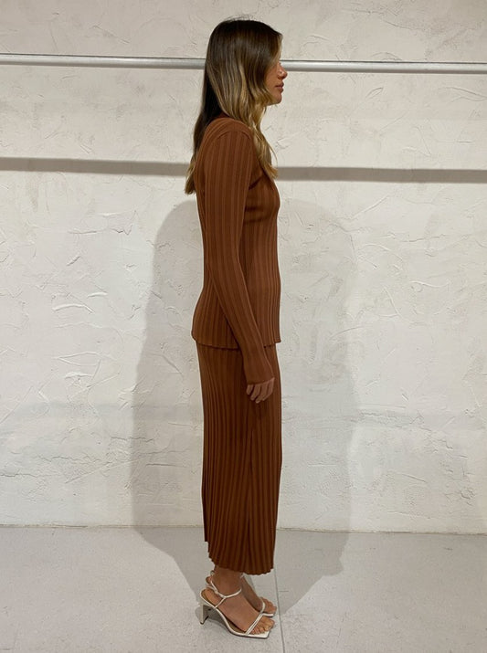 The Harley knit Skirt in Walnut from Ena Pelly has us falling for rib knit silhouettes in warm chocolate hues.