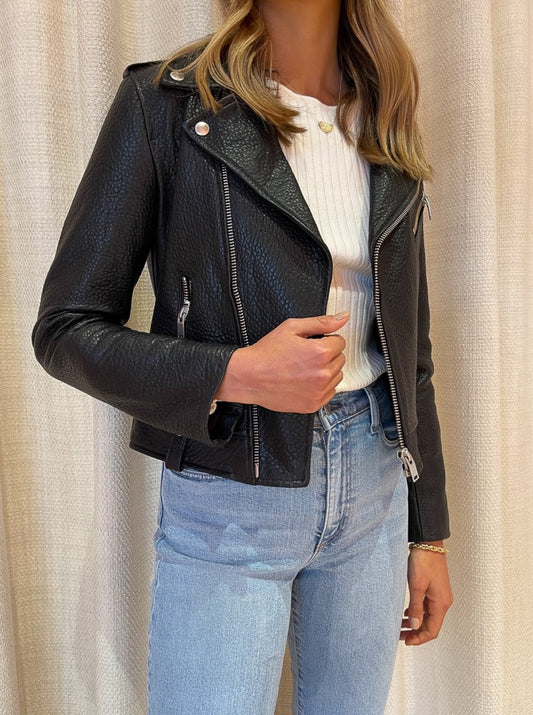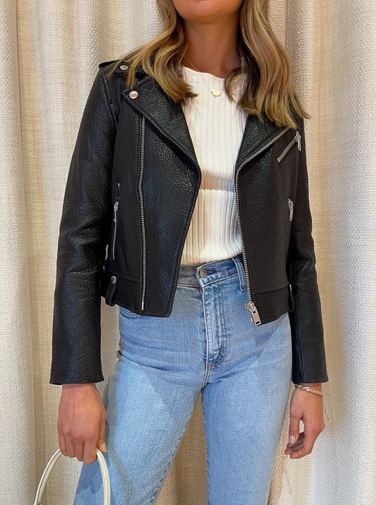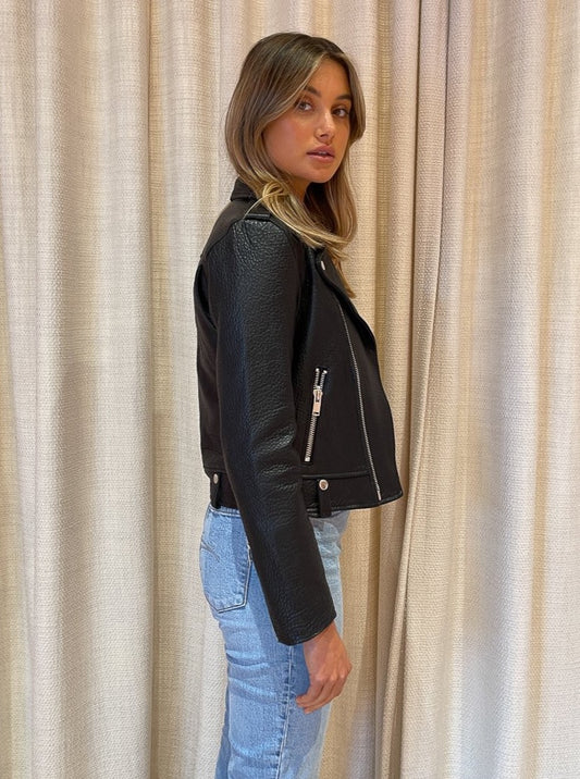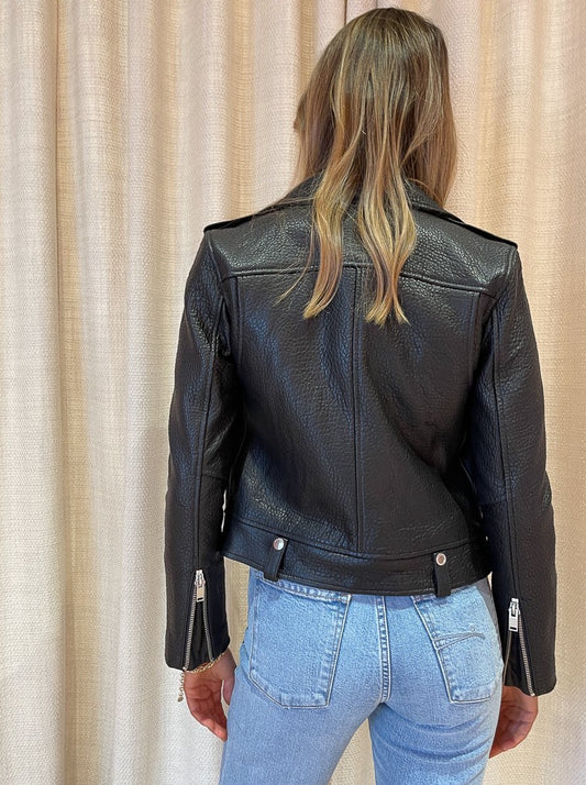 Ena Pelly Minimalist Biker Jacket in Black/Silver/Pebbled