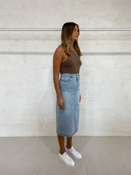 The Pippa Denim Skirt by Ena Pelly is a timeless piece for your transeasonal wardrobe
