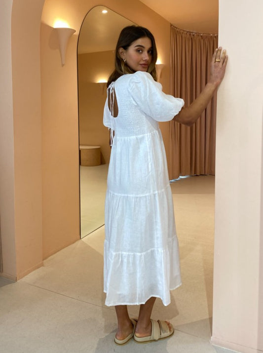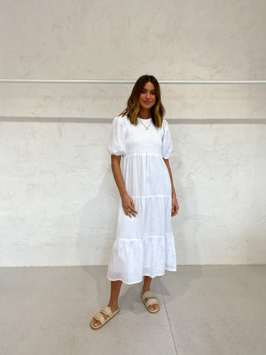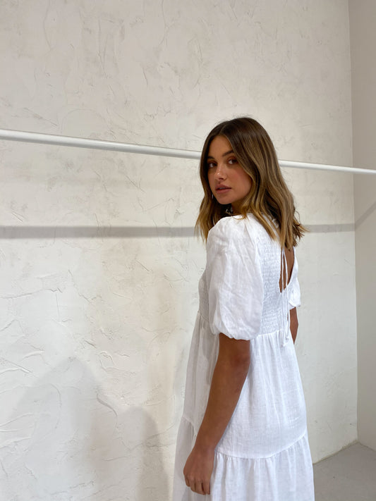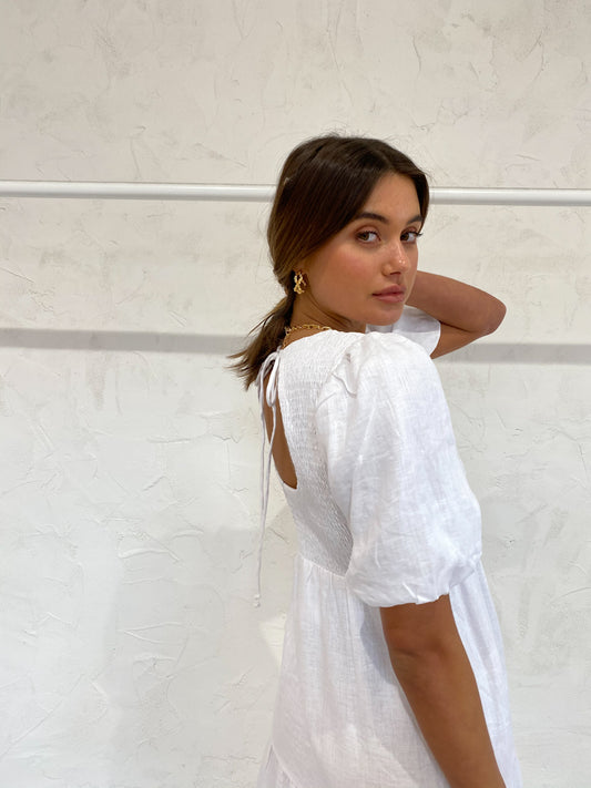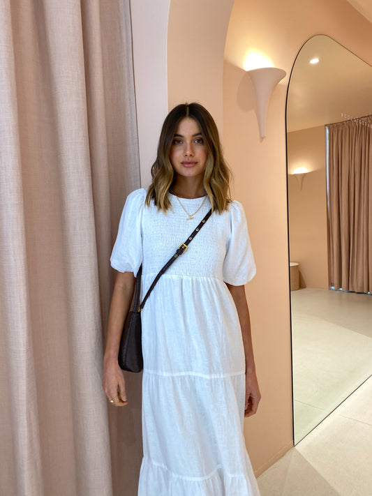 The Alberte Midi Dress in White from Faithfull the Label is classic and contemporary and will be a timeless and wearable additional to your wardrobe.