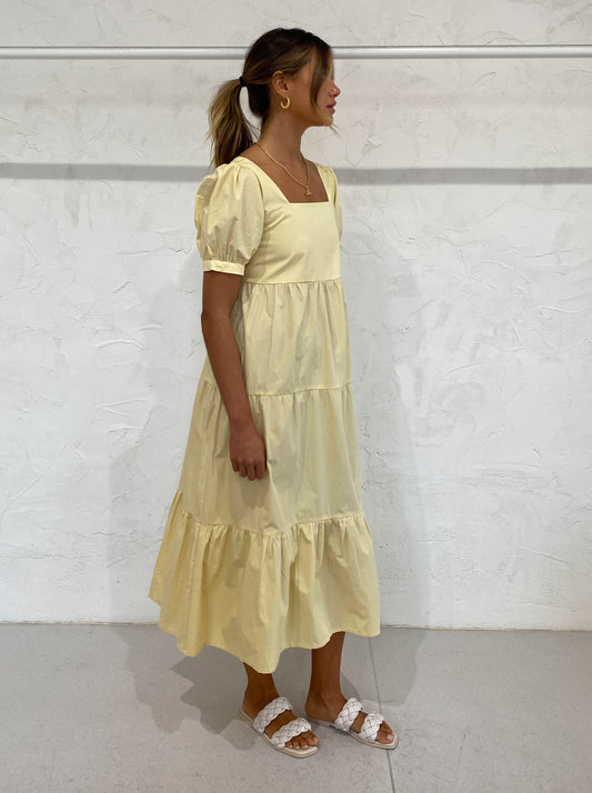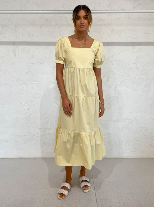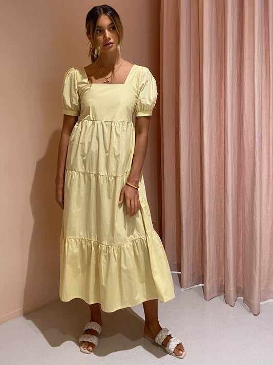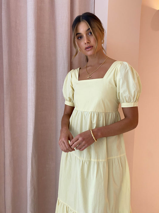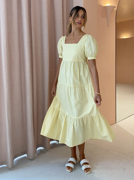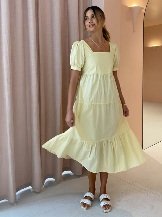 The Aylah Midi Dress in Plain Banana from Faithfull The Brand is the sweetest shade of pastel yellow to add to your transeasonal wardrobe.