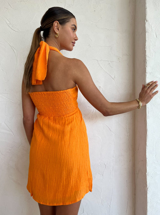 Crafted from a lightweight linen blend crinkle fabrication, this bright and bold halter neck mini dress features a statement knot and cutout at bust before falling into a soft mini skirt.