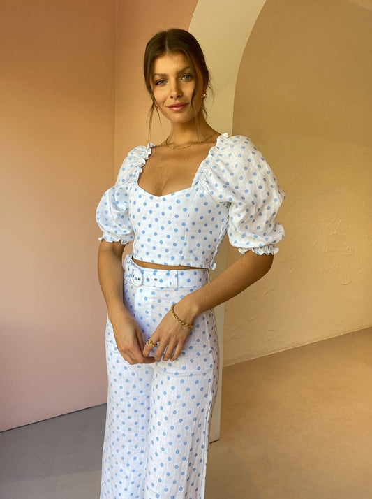 The soft blue dotted linen fabric, along with the removeable belt and flare style make these the perfect piece to bring you through the warmer seasons in effortless style.