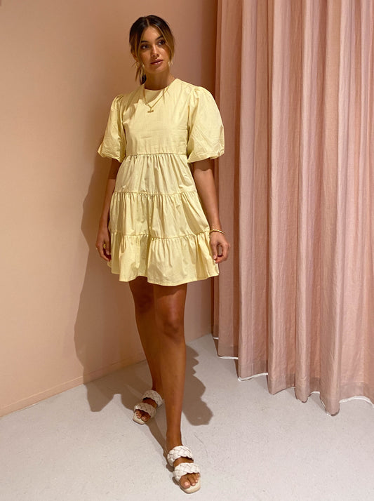 The Sade Mini Dress in Plain Banana from Faithfull the Brand is the sweetest shade of pastel yellow to add to your transeasonal wardrobe.