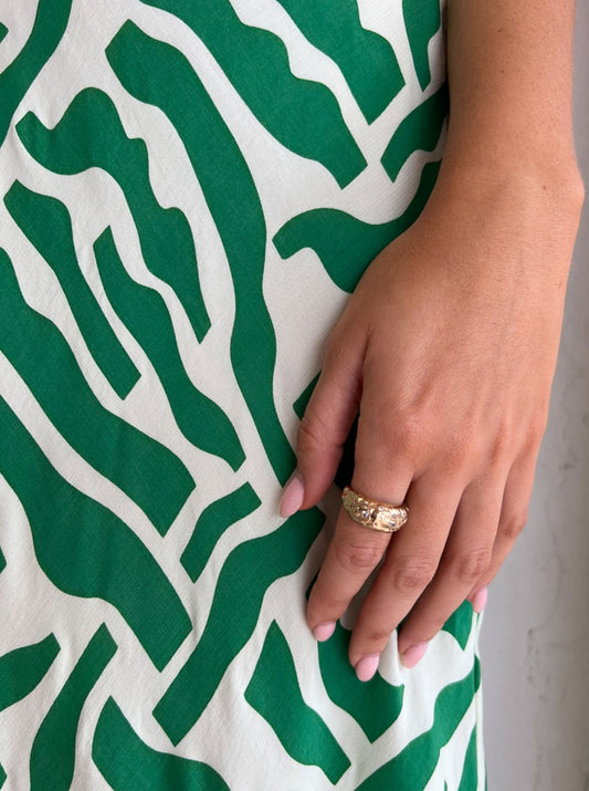 Crafted from a crepe fabrication in a hand-printed eye-catching green retro motif, this midi dress features a scoop neckline, front cut out, and gathered bodice.