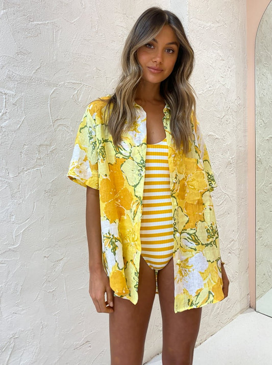 Making a statement with its hand printed Marigold stripe, the Solene can be worn on its own for beach days and transition into lunch dates by popping on some denim over the top.