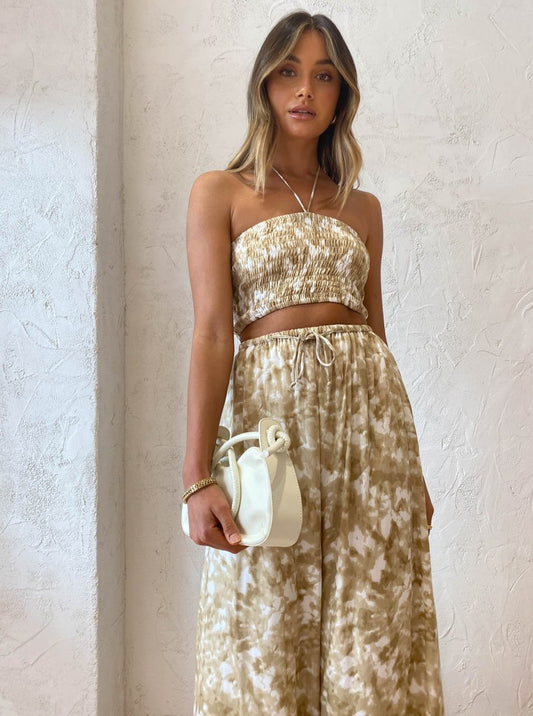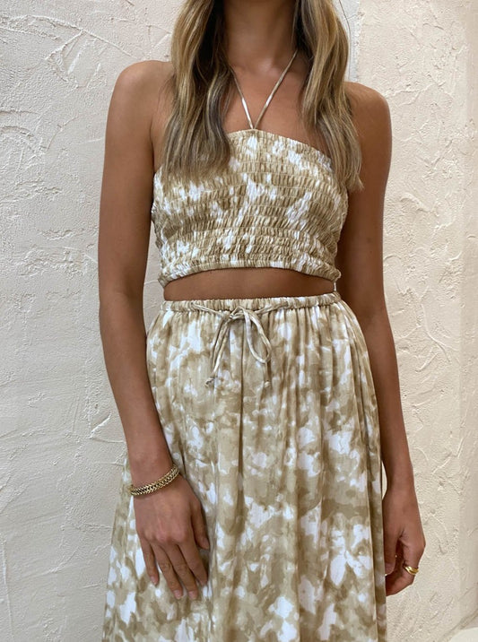 A summer staple, this cropped top is crafted from a taupe and white tie dye printed Linen fabrication.