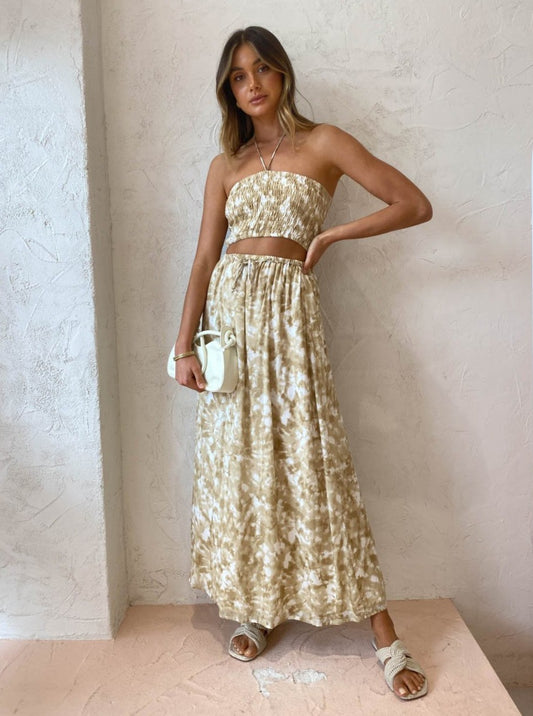 Coco Styling Tip: For Sun-kissed garden parties through to balmy twilight date nights, style with the matching Jovianne Maxi Skirt in Roos Tie Dye, the Mara & Mine Fernanda Sandal in Natural, the Brie Leon Tie Knot Baguette Bag in Off White and Porter Heritage Bracelet in Gold