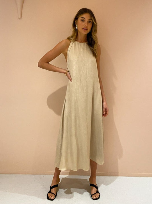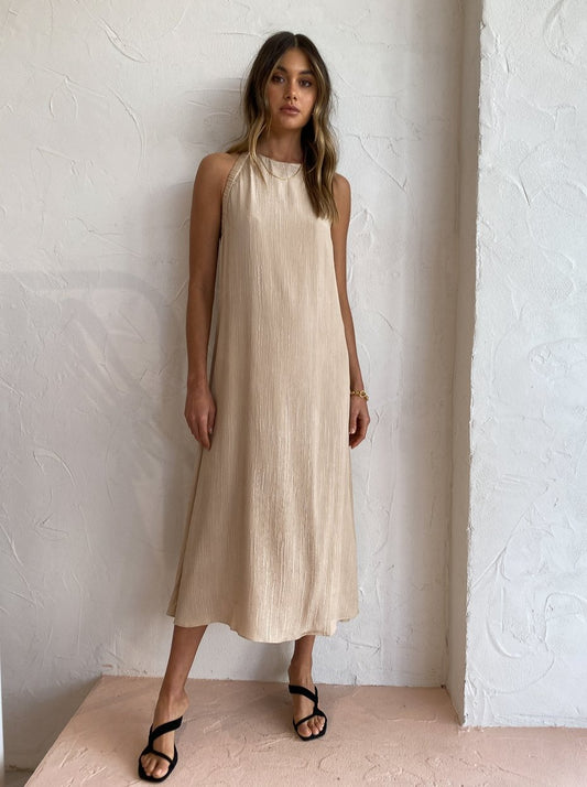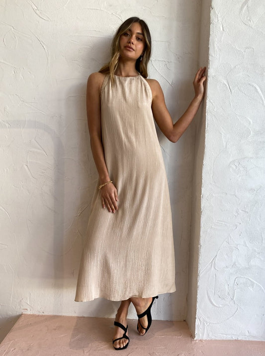 The Harper Halter Silk Plisse Dress in Almond by GINIA has us loving soft silhouettes with a minimal and sophisticated touch.
