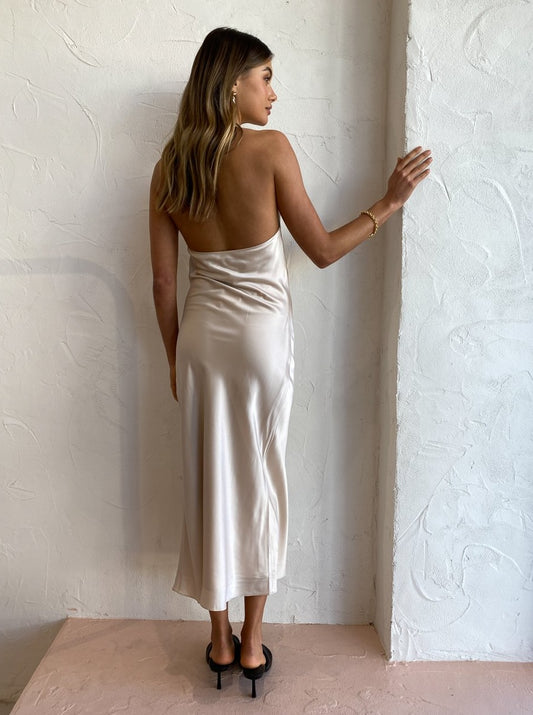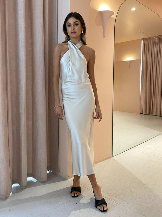 A glamorous wrap style halter neck silhouette, the Willow makes a statement with its intricate front body draping. Cut on the bias and crafted from a gorgeous silky fabrication, this standout style allows Coco girls to effortlessly glide through their Coco occasions.