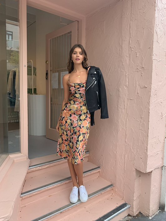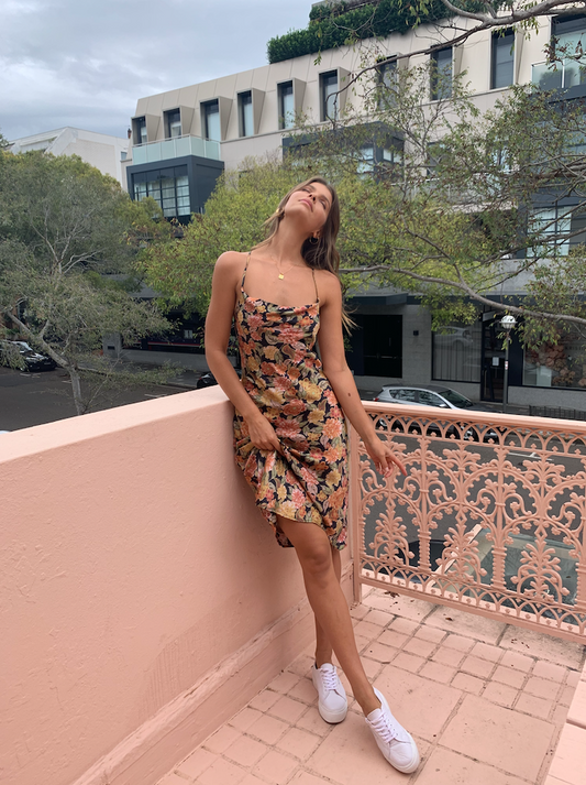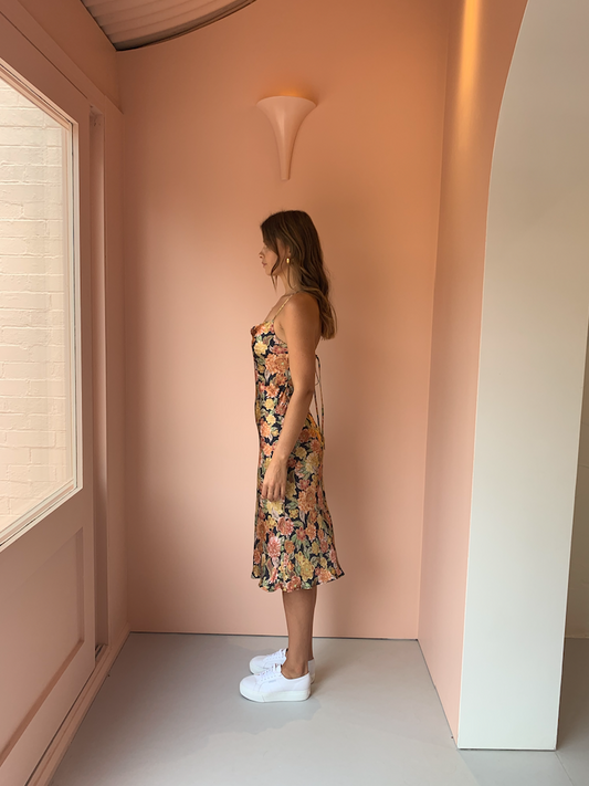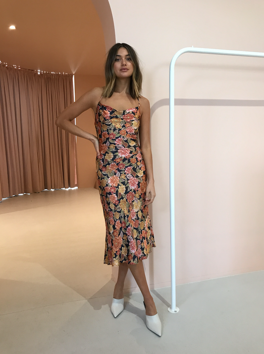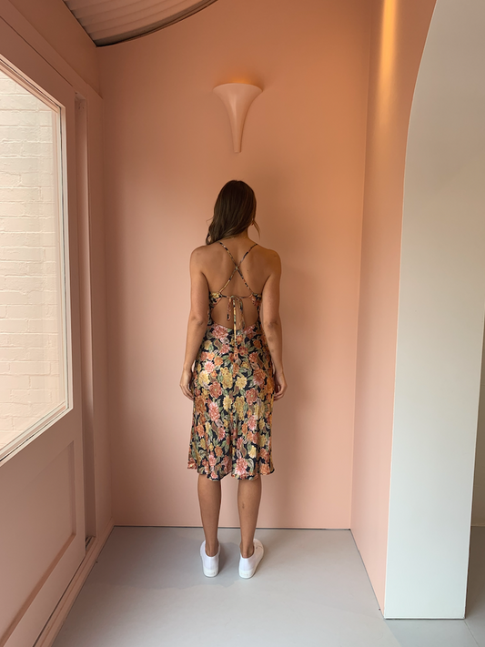 This cowl neck midi dress features an exclusive floral print and is cut on the bias for a flattering fit. What we love most about this piece is the lace up back.