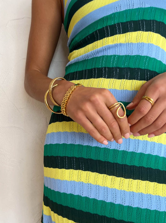 Style with the Alias Mae Zi Heels in Cream, Porter Mali Hoops in Clear, Porter Chunky Belcher Necklace 2.0 in Gold, Porter Wave Ring Set in Gold, Porter Harp Ring in Gold, Porter Pond Bangle in Gold, Porter Frill Cuff in Gold and the Porter Heirloom Bangle 6mm in Gold.