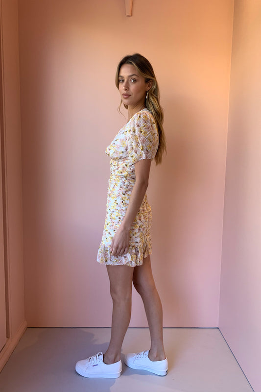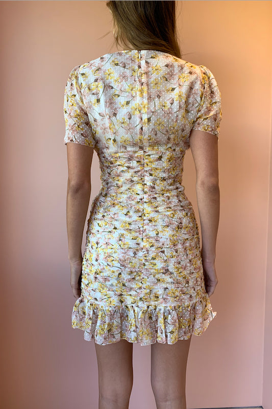 Cut from 100% Silk Garden Print features a gathered skirt panel and a fitted top panel with a cap sleeve with tucks on the cuff of the sleeve. Finished off with a ruffle on the hem of the dress.