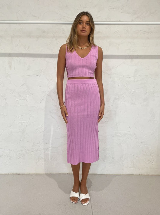 The Hansen & Gretel Orion Skirt in Orchid is our Coco colour crush of the season, in a classic midi silhouette with a twist.