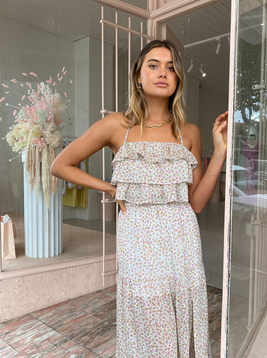 Designed in a feminine micro floral print, and featuring tiered ruffles, a halter neckline and an open back, pair this with existing pieces in your Coco wardrobe.