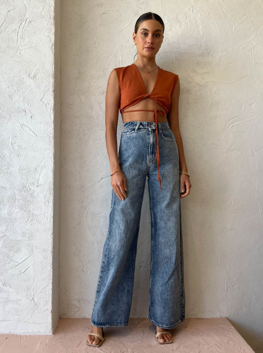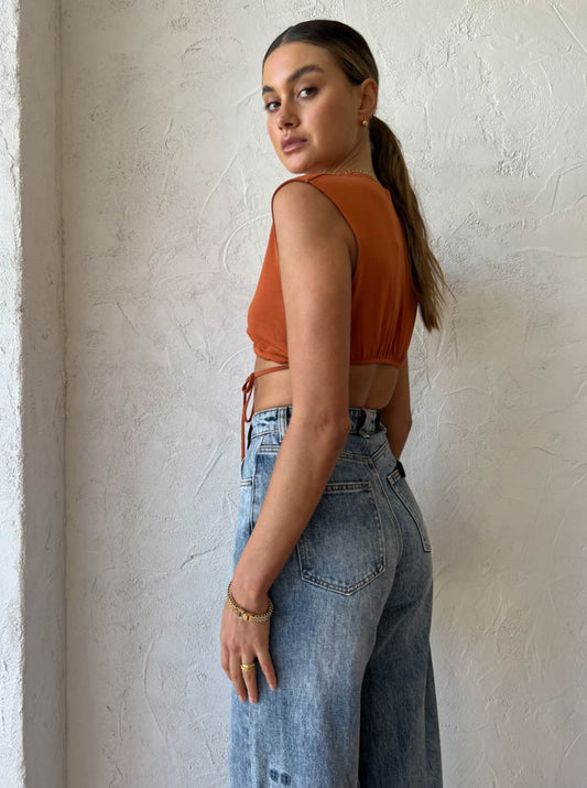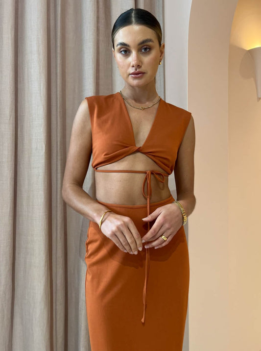 Thoughtfully crafted from a soft to touch ribbed knit, this flattering crop features a twisted front and tie that can be wrapped around the waist.