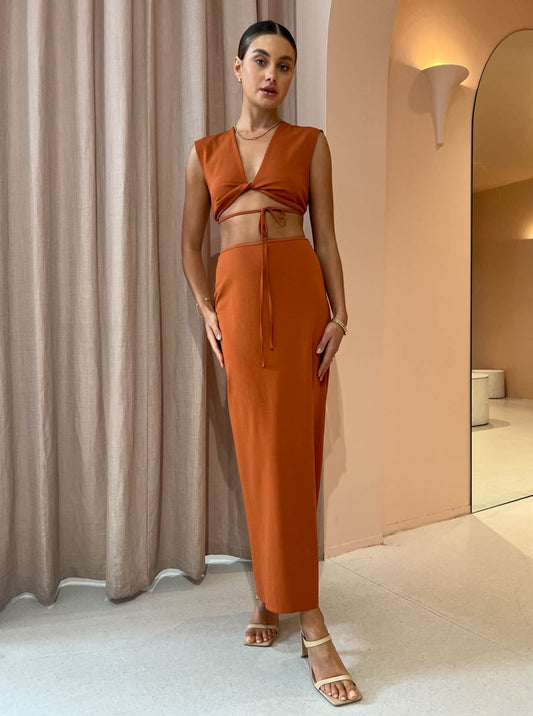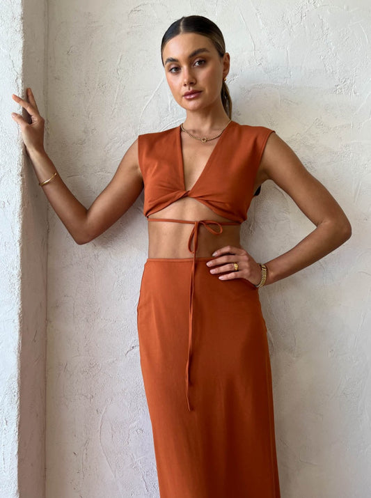Balmy Coco occasions are to be celebrated in the effortlessly romantic Whitaker Top in Cinnamon from Hansen & Gretel