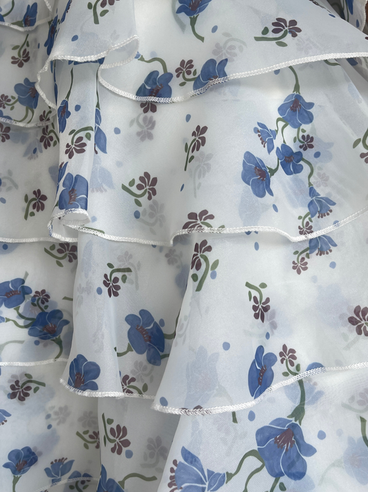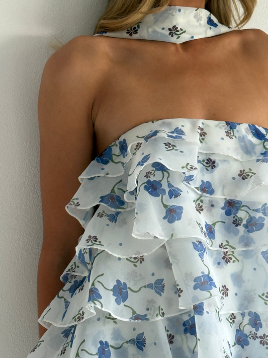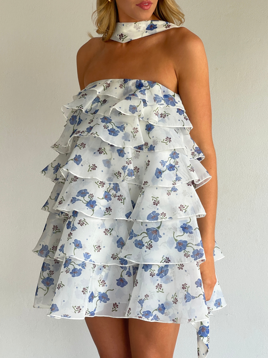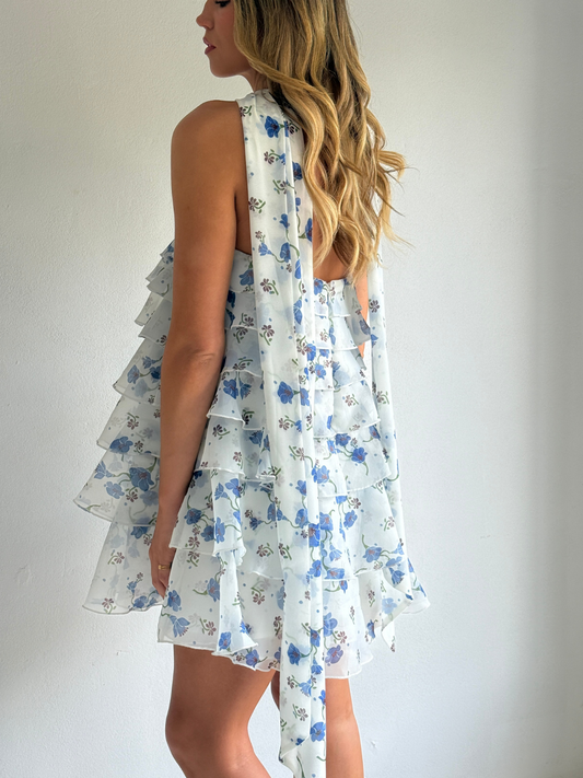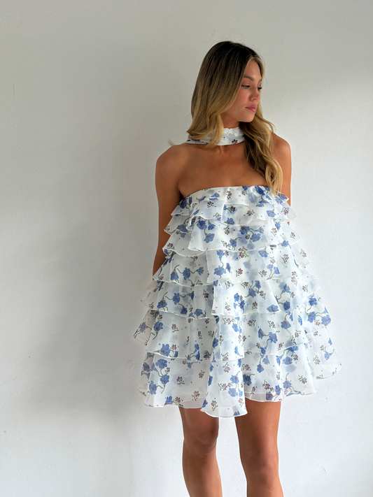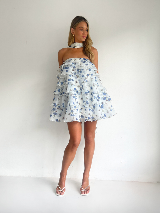 The Issy Celeste Mini Dress in Blue Belle is made from a soft organza with graduating ruffles throughout.