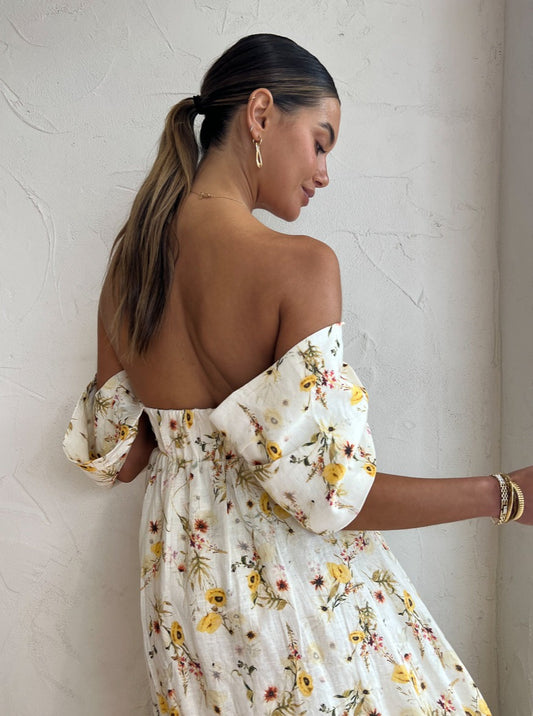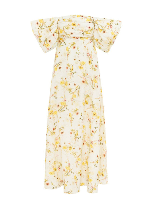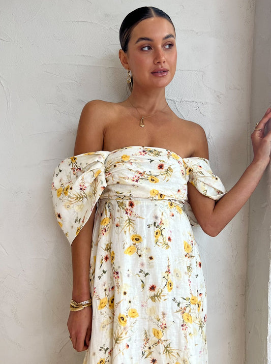 Crafted from a crisp Linen fabrication, this playful midi dress features a square neckline, button detailing down the centre front and exaggerated puff sleeves that can be styled on or off the shoulder that is balanced with a soft tiered midi length skirt.