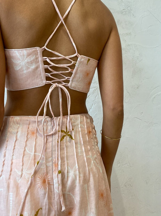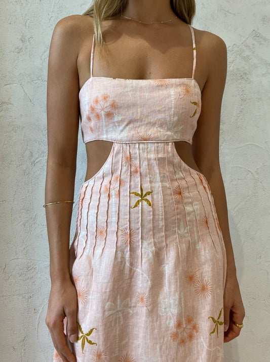Designed to be worn with ease and comfort for day to night occasion, the Evelyn Dress is crafted from a beautiful Cotton fabrication with a summer inspired palm tree print. Flattering the femme silhouette, it features a square neckline and slim straps, a fitted bodice and soft flowing A-line midi length skirt with pin tuck detailing.
