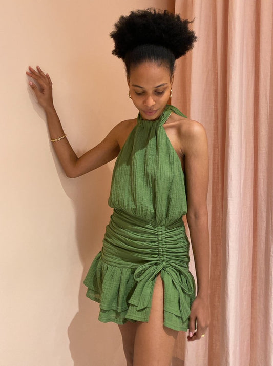 Designed in a beautiful Ramie and Cotton blend, this halter style dress with an open back and shirred skirt will have you looking effortlessly elevated at all your upcoming events.