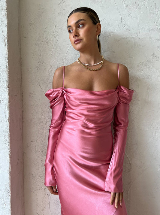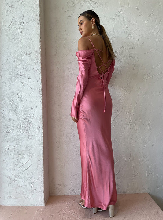 Delicately crafted from a lustrous satin fabrication, this longline maxi is cut on the bias to skim and flatter the silhouette. Featuring long sleeves that drape of the shoulder, a flattering cowl neckline and thin adjustable straps before falling effortless into a fluted maxi hemline.