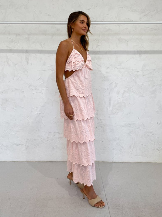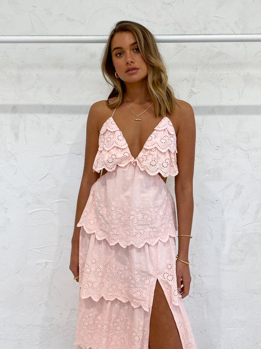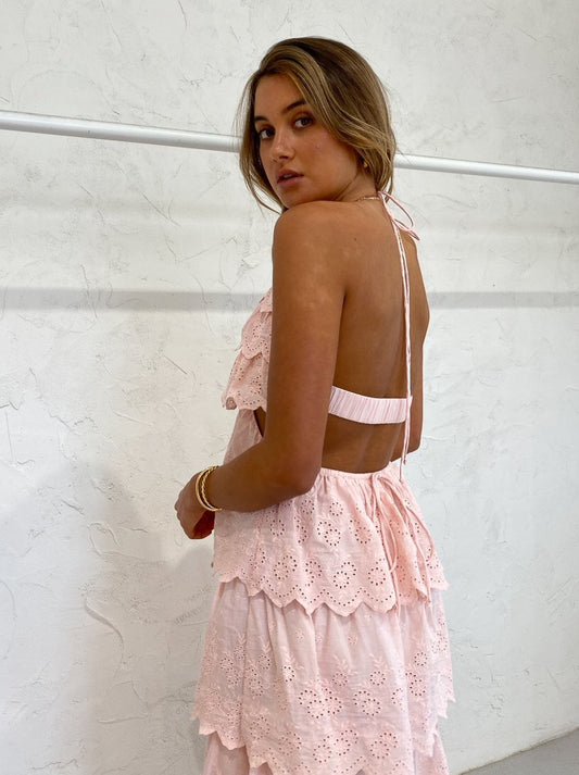 The eyelet detailing, frill layering, open back and front split will have you looking effortlessly elevated and feminine all summer long.