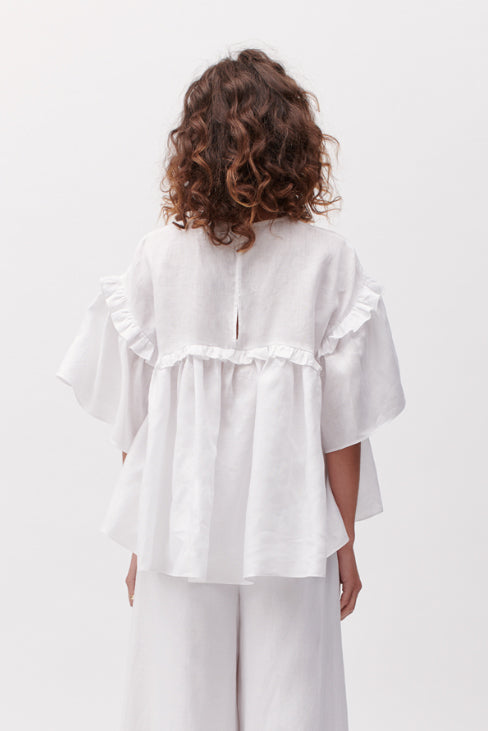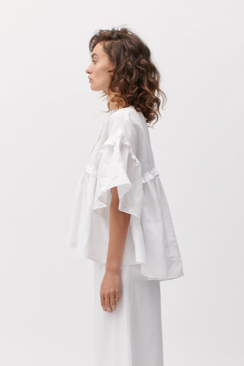 The Joslin Amila blouse is an oversized smock styled top with soft, ruffle and gathering detailing and split back neckline with slightly flared sleeve.
