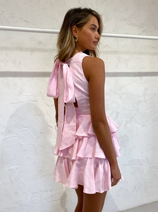 Crafted from a sustainable linen and featuring a ruffle overlay with their signature fabric covered buttons and spaghetti ties on the sides.