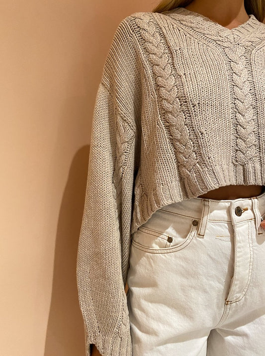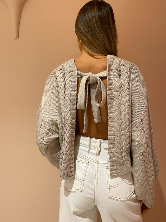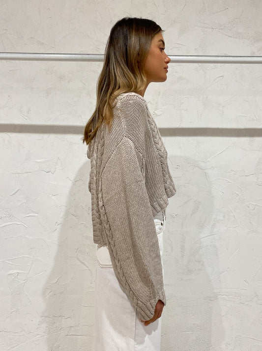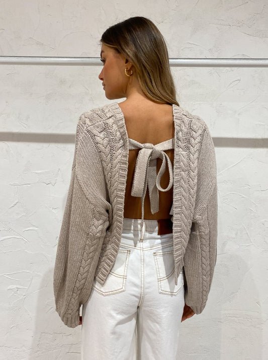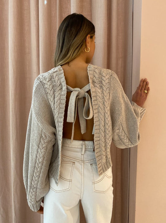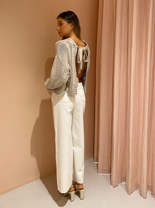 Designed to be worn with ease in an oversized shape, the Bethany is a layering piece cut with a drop shoulder and dramatic bell sleeves with ribbed cuffs. Loved for its intricate cable knit plaiting detail around the neckline, sleeves front and back and the unexpected exposed back with a self-tie detail.