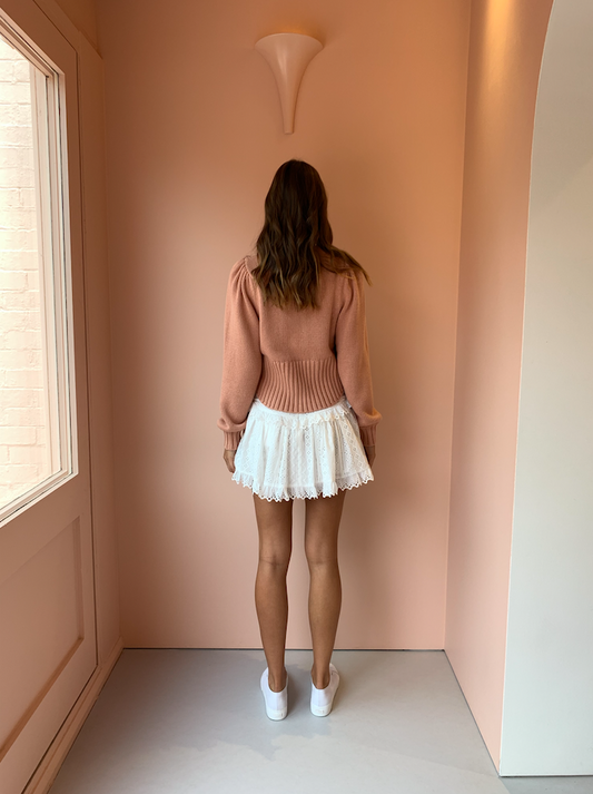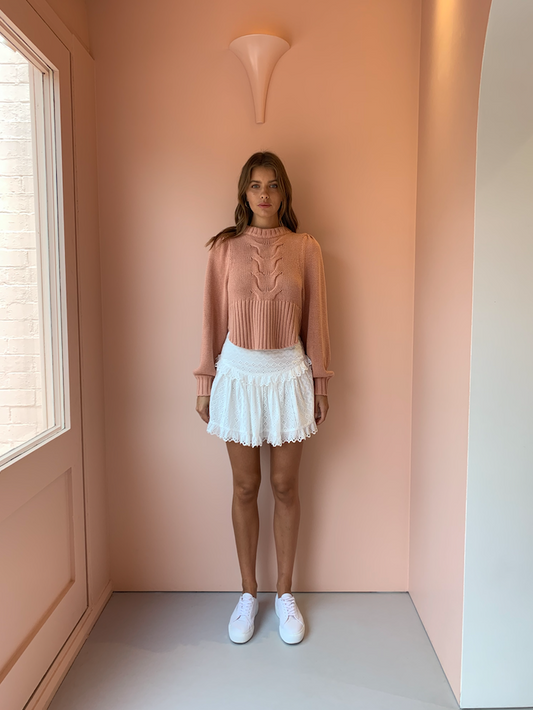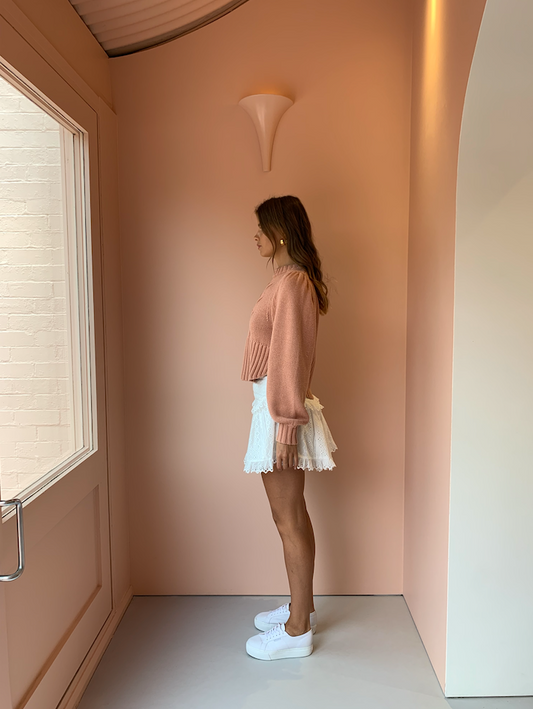 A Coco HQ favourite. The Joslin Kristin Cotton Cashmere knit in Dune Pink has been styled with our Carver Astrid skirt in White. Mix and match with exisiting pieces in your wardrobe for a chic Autumn/Winter look.
